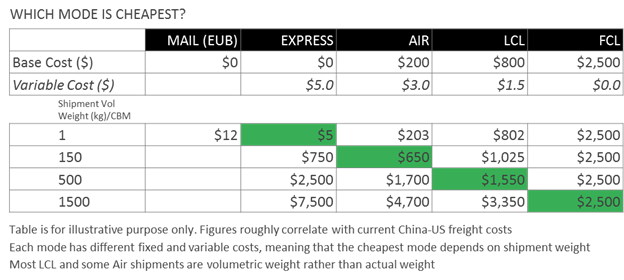 While modes with lower variable weight cost are the cheaper selections for larger cargos, even if their base cost is high.